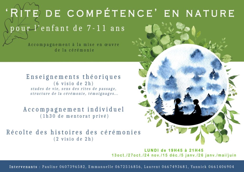 Les rites de passages manquent cruellement pour permettre le cheminement du développement naturel. Nous vous proposons une formation permettant de mettre en place un « rite de passage » pour les enfants entre 7 et 12 ans. C’est aussi un voyage pour la famille et la « famille élargie ».