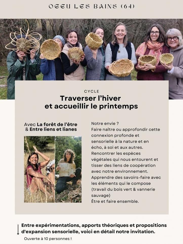 👩🏾🌾Marion: « Au cours de ce cycle, je vous proposerai de découvrir et travailler différents végétaux présents en abondance autour de vous. A l’entrée de l’hiver, nous serons en lien avec les arbres et réaliserons des objets du quotidien en bois vert : cuillères, spatules, kuksa … Puis nous plongerons dans l’univers des lianes avec un WE 100% technique autour du panier sur arceaux. Vous acquerrez des bases solides pour vous engager, dans différentes créations sur arceaux (sac à main, paniers muraux…).